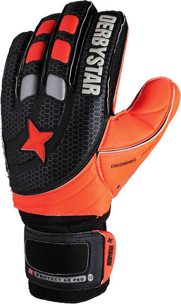 De Derbystar Protect Ar Pro is een zeer duurzaam allround keepers handschoen. Deze handschoen heeft een flat cut vinger protectie technologie met verwijderbare strips. De Derbystar Protect Ar Pro heeft het schuim een 3 mm granier lijm schuim oranje en de rug is van latex en EVA schuim voor een zacht gevoel. Deze handschoen heeft een zeer goede schokdemping. De Derbystar Protect Ar Pro heeft een optimale pasvorm. Als sluiting heeft deze handschoen een elastische bandage met brede klittenbandsluiting gemaakt van EVA schuim. Deze handschoen heeft uitstekende hechting eigenschappen en goede vang eigenschappen in alle weersomstandigheden.
