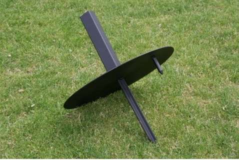 Deze voetplaat is rond 50 cm en 3 mm dik. Voorzien van een lange t-pin voor stevige verankering in de grond en een korte pin om eventueel draaien tegen te gaan.